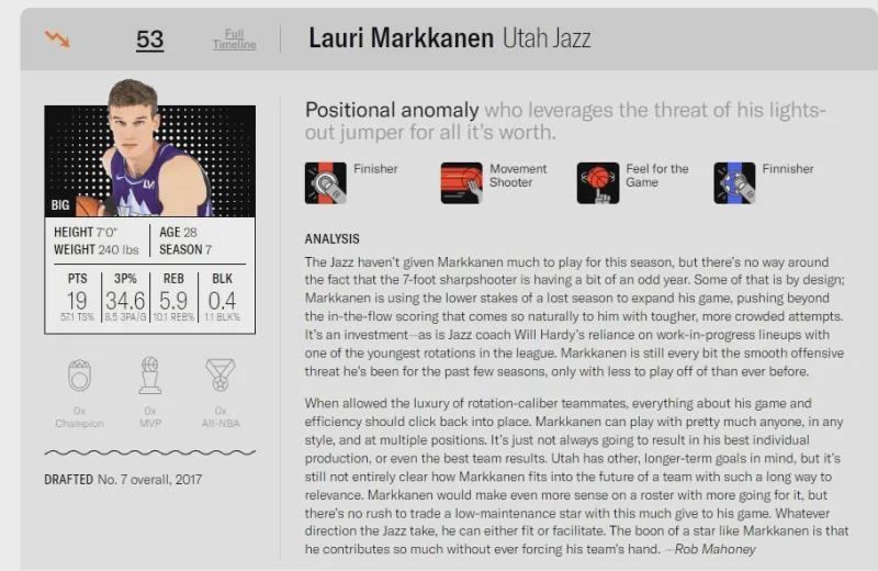 简单概括网站评价就是,上赛季马尔卡宁在继续蛰伏练级、提升短板,尽管他在爵士队属于龙屈蛇伸,因为年纪原因肯定不在球队未来计划之内,因为具备全能属性,球队管理层永远不会为他的交易发愁,他就像是一个相貌出众、才学俱佳的待嫁女子,老狐狸安吉不见天价彩礼是绝不松口。