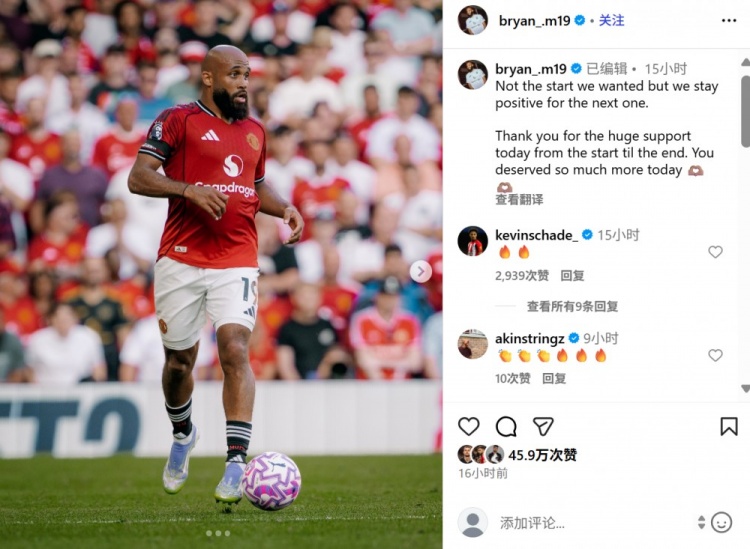 本场比赛新援姆贝莫首发登场表现不俗,赛后他在个人社媒晒出本场照片,配文写道:“这不是我们想要的开局,但是我们对未来保持积极的心态。感谢球迷从始至终的支持,你们配得上更多。”